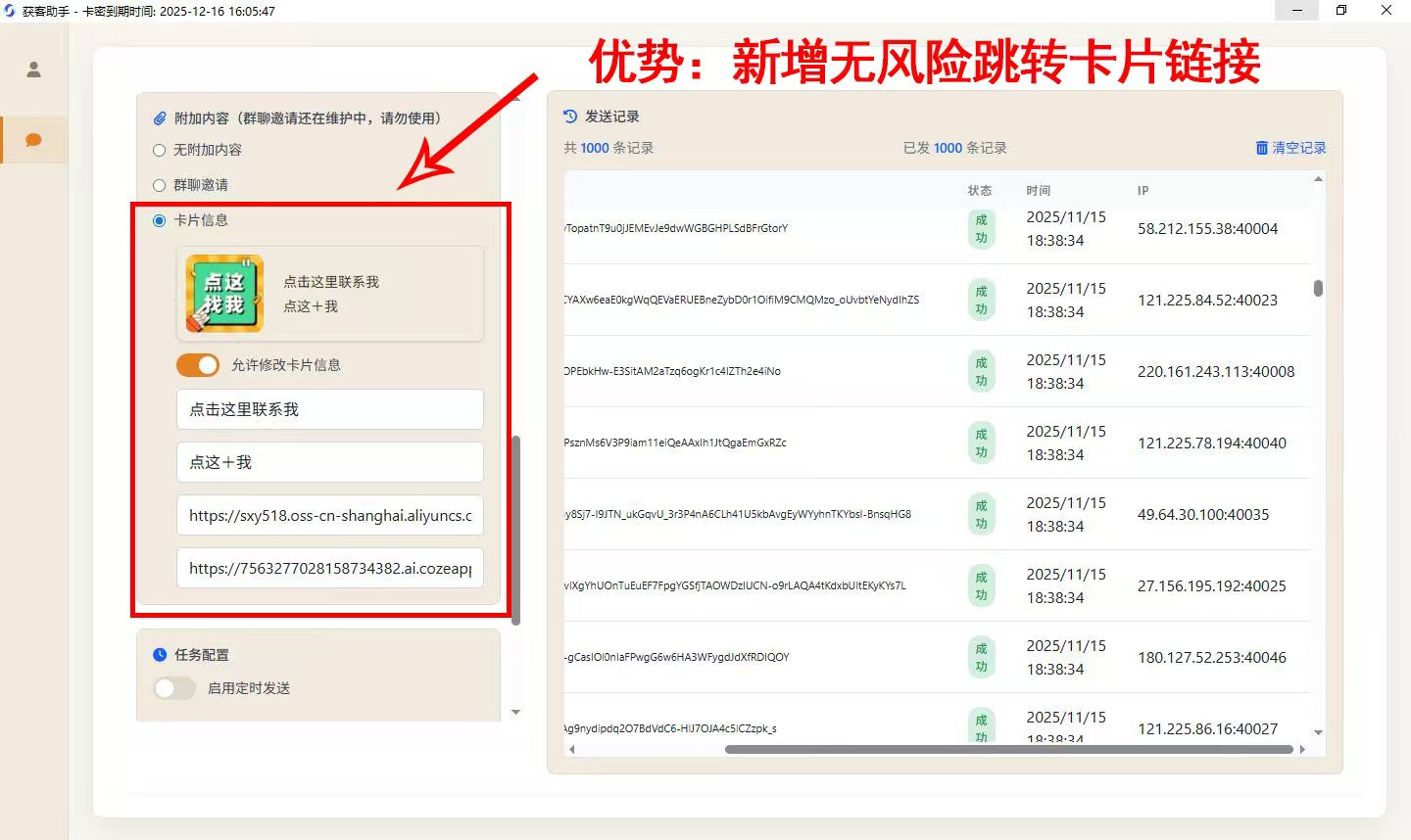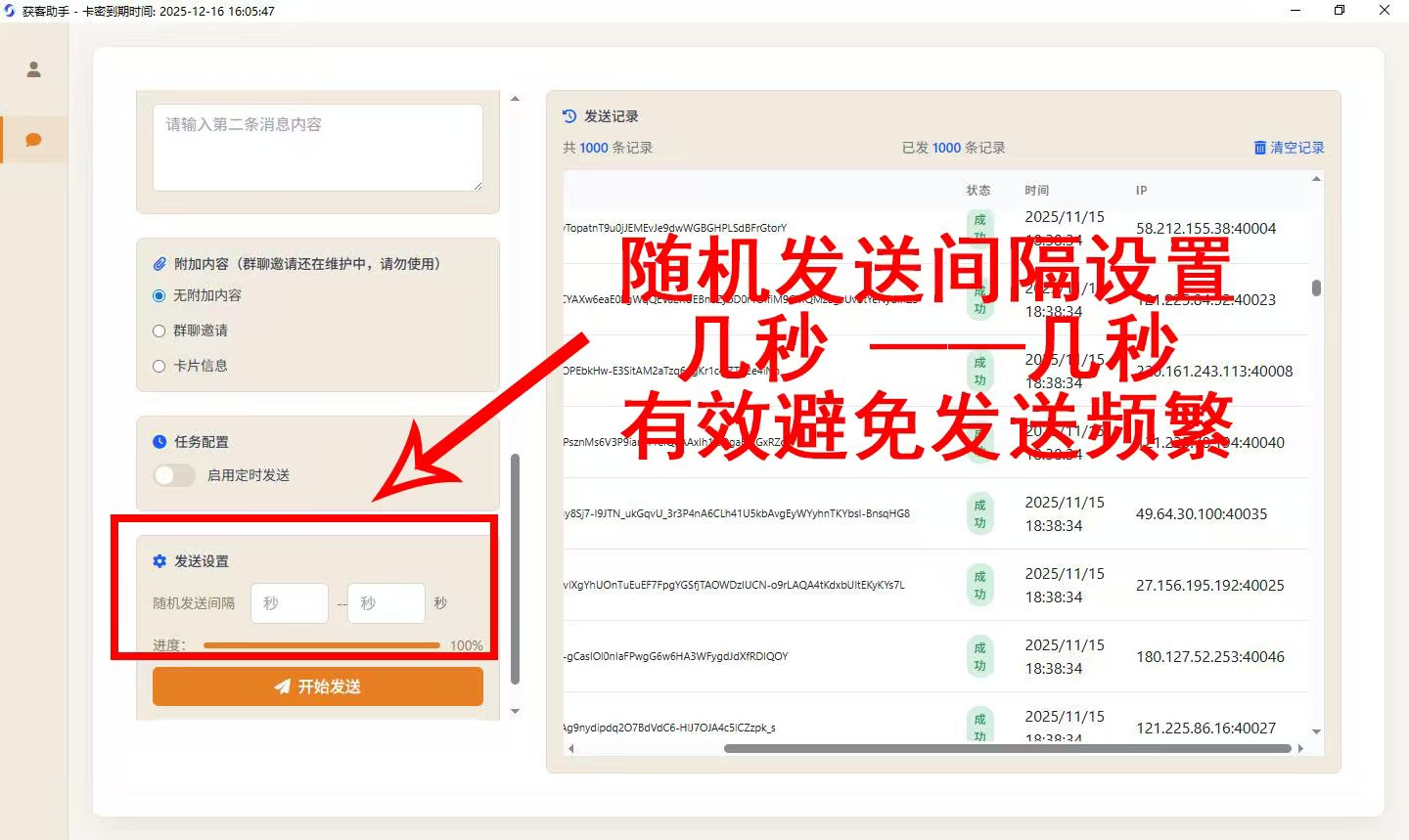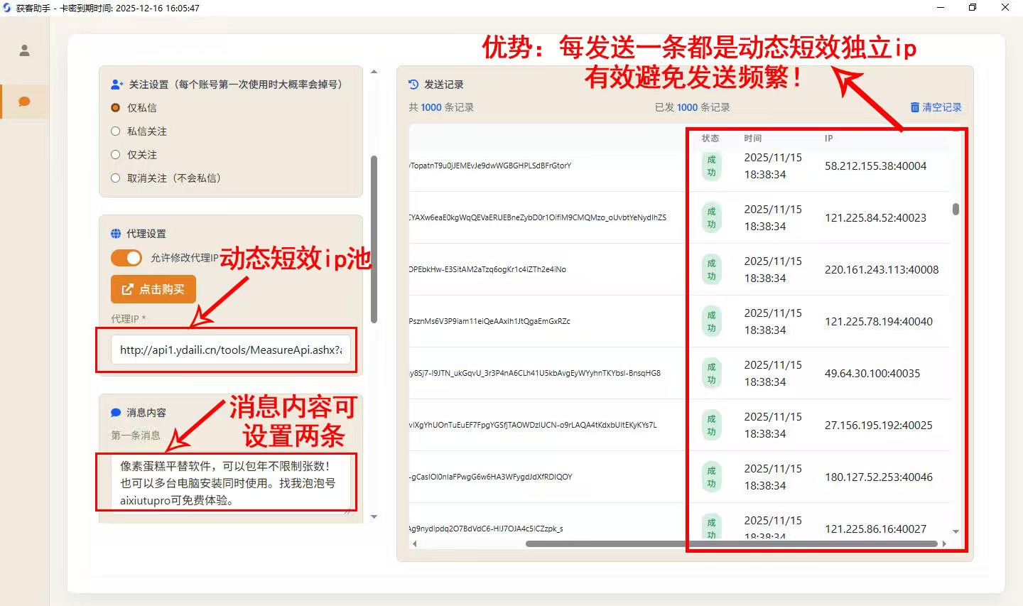 2.毫秒级动态ip接入,可实现私信秒发,1s发送一条私信